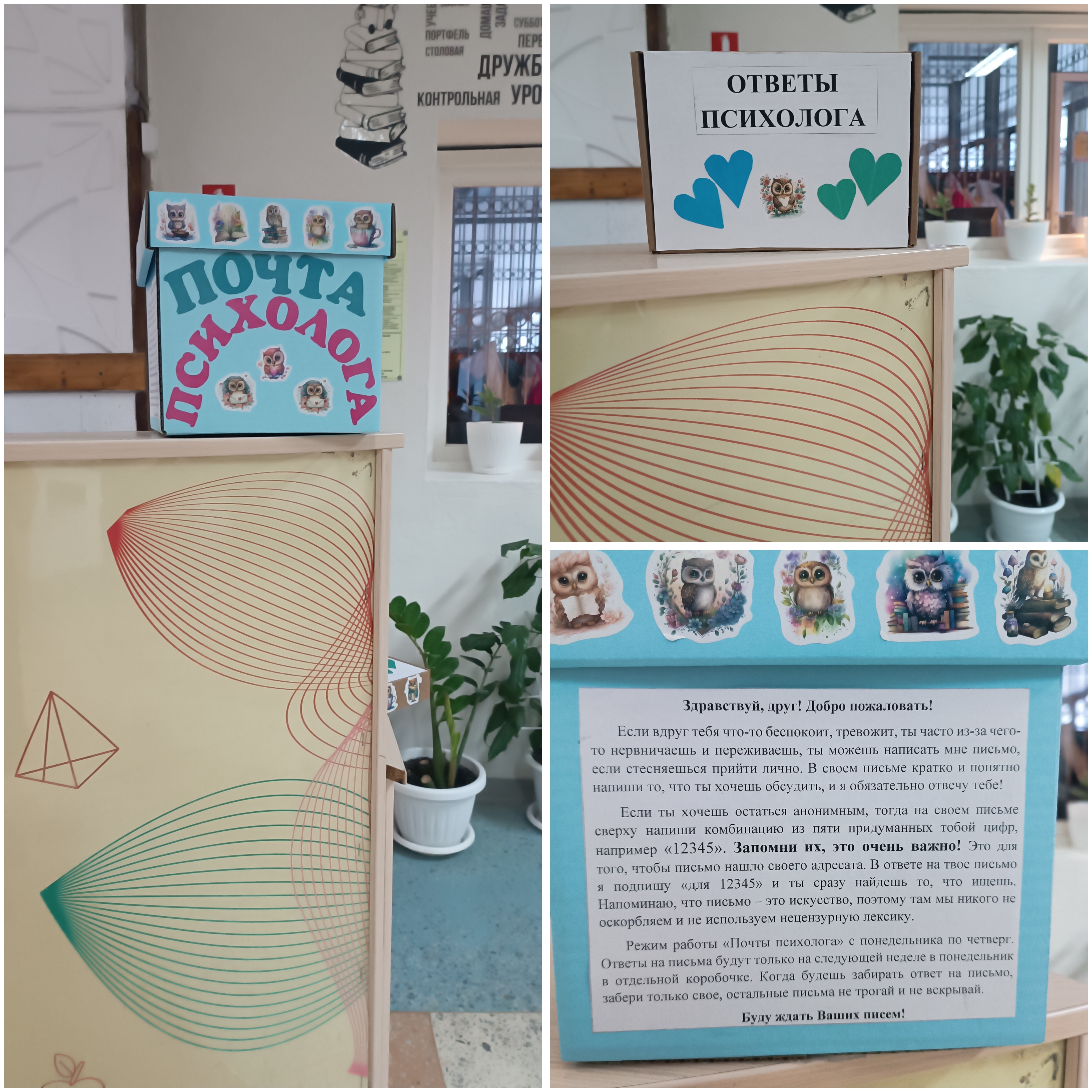 Теперь ученики и педагоги могут обратиться анонимно или открыто, обсудить личные трудности, стрессовые ситуации, конфликты, написав письмо или записку и опустив её в почтовый ящик, который находится на посту охраны. Конфиденциальность обращений обеспечена. Наши психологи обязательно прочтут каждое обращение и дадут ответ или пригласят на консультацию.